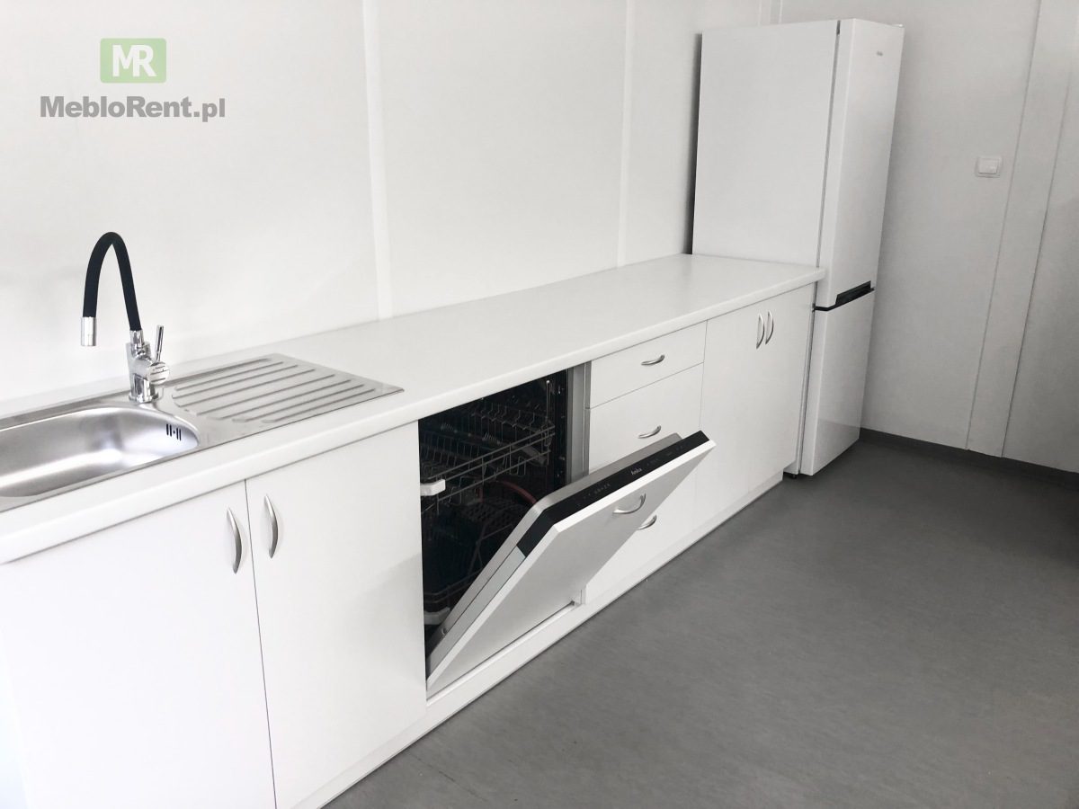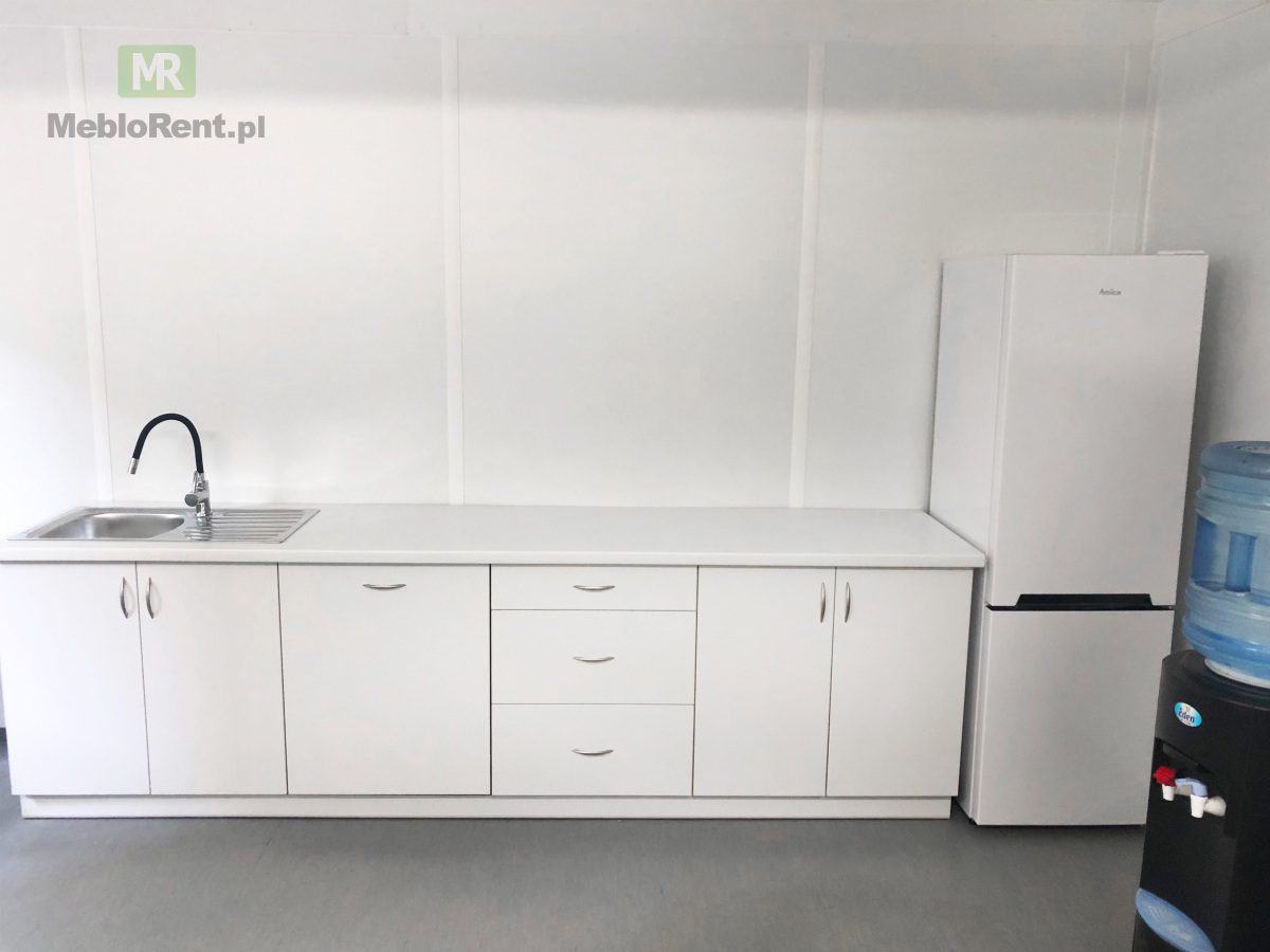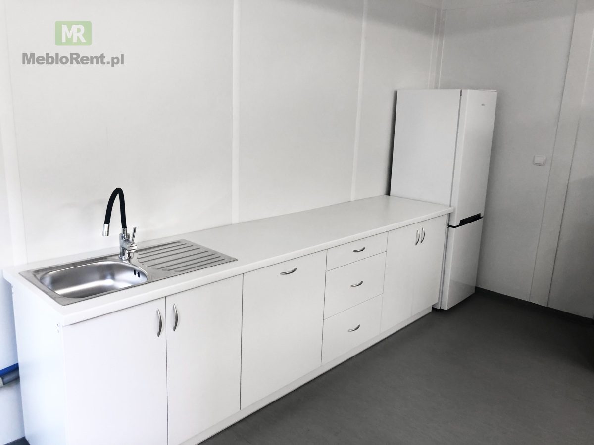 Przedmiotem zlecenia było wyposażenie zaplecza budowy w pełną zabudową kuchenną, na którą składały się: biały aneks kuchenny z pojemnymi szafkami i szufladami, zlewozmywakiem, zmywarką i dużą lodówką z zamrażarką. Pełna zabudowa kuchenna świetnie sprawdza się na zapleczach długo trwających inwestycji – zapewnia komfort i wygodę pracowników.